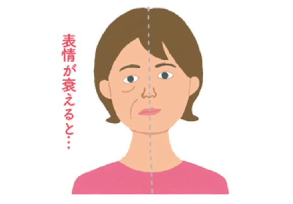 上のイラストの顔の半分を手で隠して左右の顔を見比べると、表情筋が衰えていない右に比べ、表情筋が衰えた左は疲れてやつれた印象に。