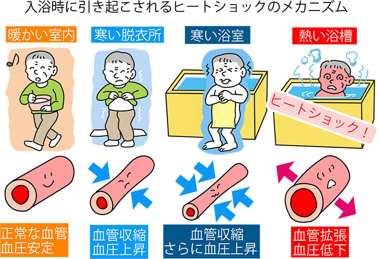 最も発症しやすい状況として、暖かい部屋から寒い廊下、脱衣所、浴室を経て、熱い湯で満たされた浴槽につかる場合が挙げられます。