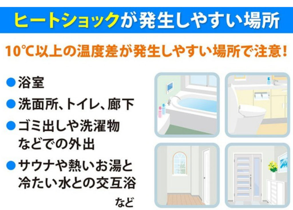浴室以外でも【10℃以上の温度差がある場所は、ヒートショックを起こす恐れがある】ので気をつけてください。