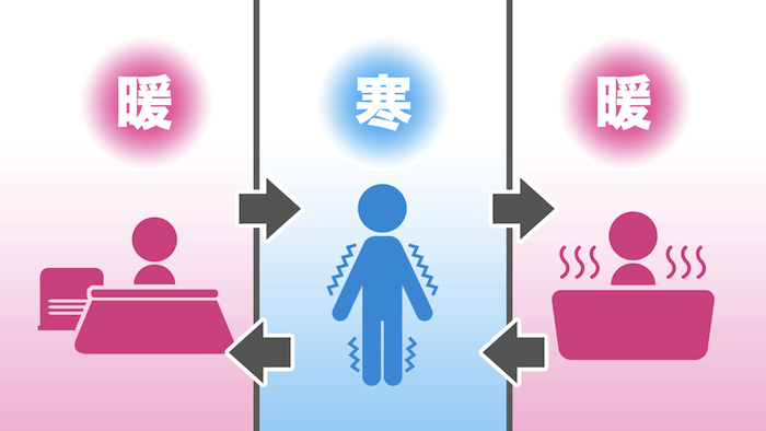 浴室以外でも【10℃以上の温度差がある場所は、ヒートショックを起こす恐れがある】ので気をつけてください。