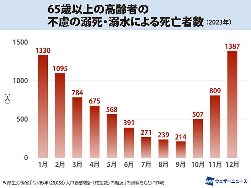 月別では12月が1387人と最も多く、1月が1330人、2月が1095人と、冬場に溺死・溺水による死亡事故が集中していることがわかります。この数字には転倒などが原因のも含まれていると思いますが、冬場に多く発生していることから、寒い時期はヒートショックによる件数が多く含まれていると考えられます。